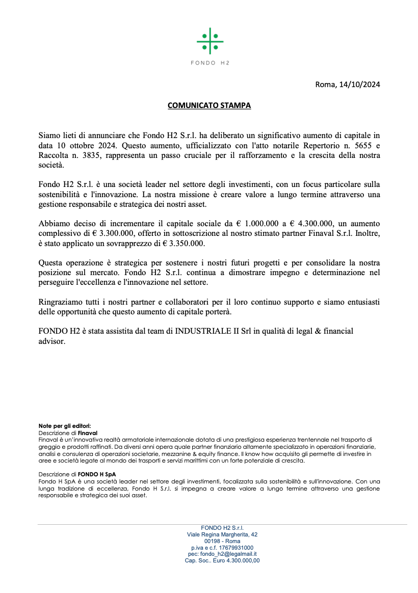 Published in: Comunicato Stampa del 14/10/2024, Roma Author Fondo H Published on: 16 Ottobre 2024 Scarica il Comunicato Stampa